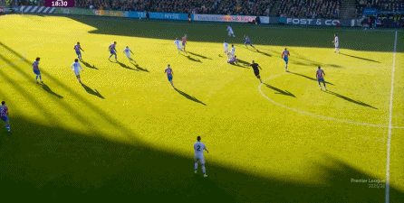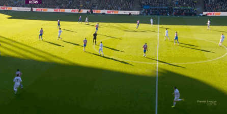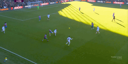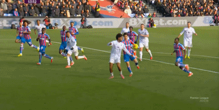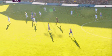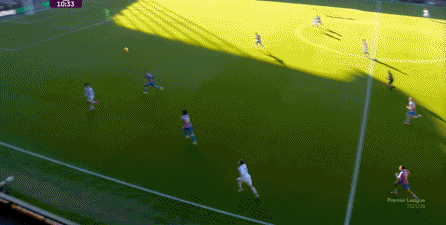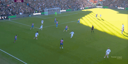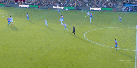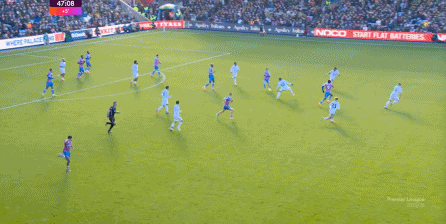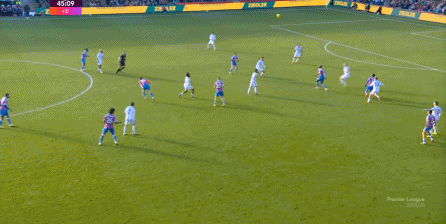在这样截然不同的支点效果之下,两支球队的进攻自然也呈现出了完全不同的样子,比如在第12分钟,水晶宫就打出了一次非常流畅和轻松的转移进攻,带出了左侧的传中: