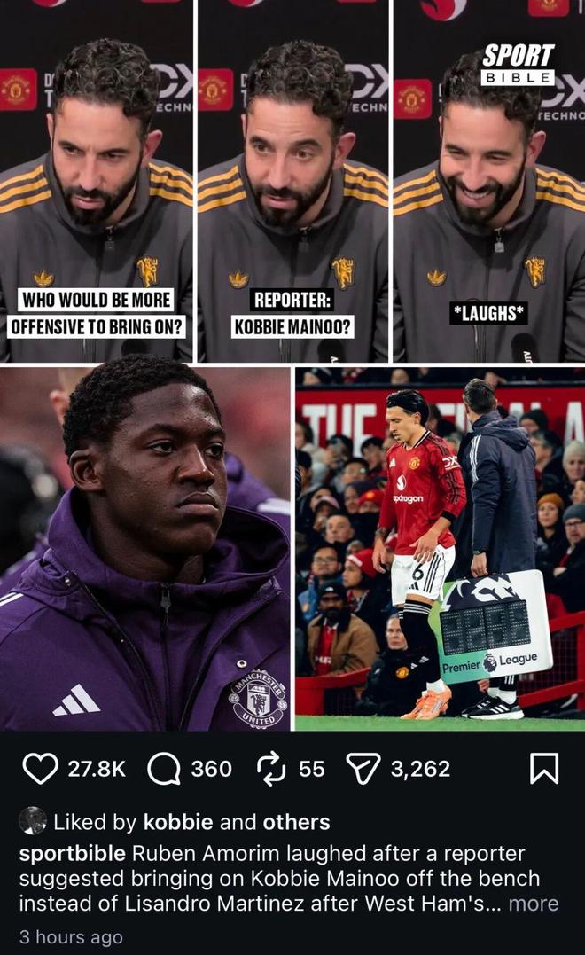 当然阿莫林表示曼联替补席没人可以出场提升攻击力时,英媒提到了梅诺的名字,阿莫林忍不住笑了起来。这颇具讽刺意味的一幕,甚至吸引了梅诺本人点赞!
